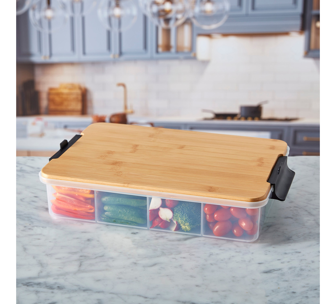 Farberware SnackleBox with various snacks and a wooden cutting board on a white background