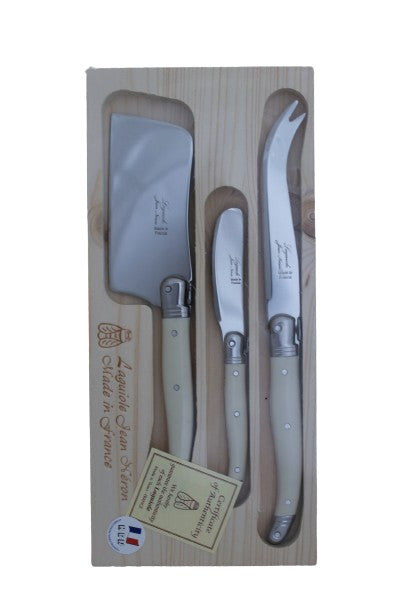Our Laguiole 3 piece cheese set by Jean Neron comes ready to gift in a lovely branded Laguiole wooden box.  Set includes a cheese hatchett, spreader and cheese knife.